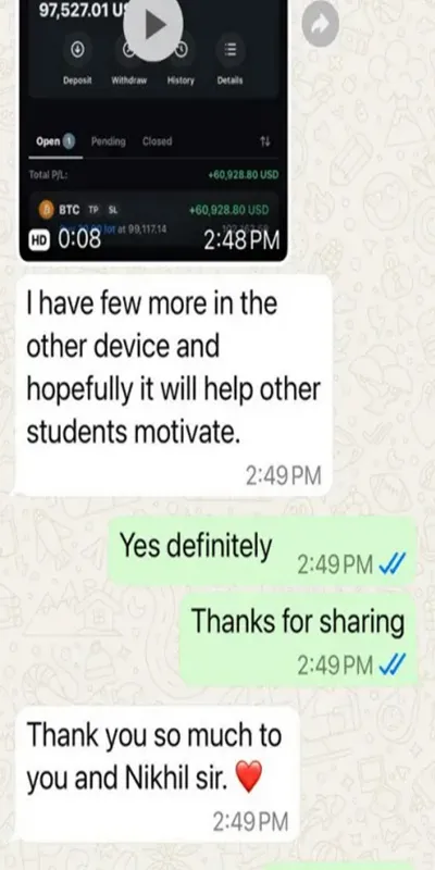but also presented in a way that makes everything so easy to understand. Whether you’re a beginner or have some experience, Nikhil’s teaching style makes learning the intricacies of trading a smooth and enjoyable experience. His guidance has been a game-changer, and I truly appreciate the value he brings to the table. Highly recommended for anyone looking to gain a deeper understanding of the market!